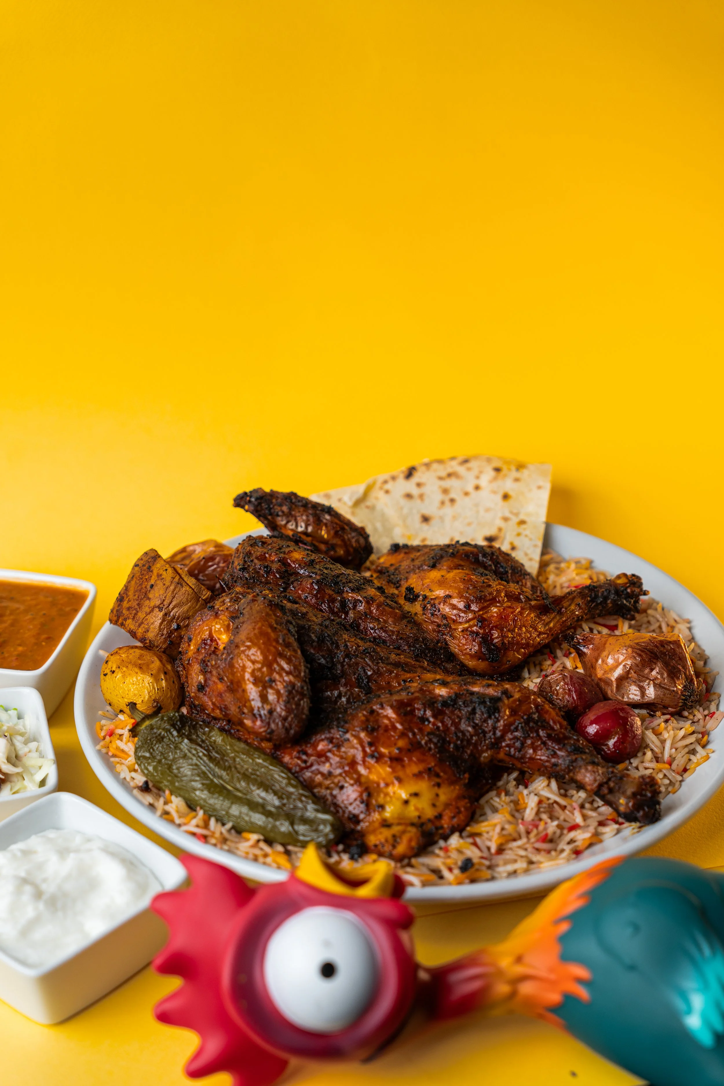 THE CHICKEN Flavors: (Original / Spicy / Garlic Basil / Smoked BBQ) $16.99 USD Half Chicken Meal Served with your choice of rice, veggies, or fries, coleslaw, & garlic Sauce. $16.99 USD $19.99 USD Chicken Hug Meal Half Chicken, served with rice, veggies, and fries, coleslaw, & garlic Sauce. $19.99 USD $31.99 USD Whole Chicken Meal Served with your choice of rice, veggies, or fries, coleslaw, & garlic Sauce. $31.99 USD $59.99 USD Family Meal Served with your choice of rice, veggies, or fries, coleslaw, & garlic Sauce. (4-5 People) $59.99 USD $89.99 USD Party Meal Served with your choice of rice, veggies, or fries, coleslaw, & garlic Sauce. (6-8 People) $89.99 USD $8.99 USD Chicken Sandwich Chicken on toasted original pita, garlic spread, and & pickles. $8.99 USD $14.99 USD Chicken Sandwich Meal Chicken on toasted original pita, garlic spread, and & pickles. Served with Fries & A Drink $14.99 USD SIDES & EXTRAS $3.99 USD Fries Fresh-Cut Fries with House Seasoning $3.99 USD $5.99 USD Rice A flavorful blend of three seasoned rices. $5.99 USD $2.49 USD Coleslaw Crisp, creamy, and refreshingly tangy. $2.49 USD $0.99 USD Garlic Sauce Smooth, garlicky, and full of flavor. $0.99 USD $1.99 USD Bread (2 pcs) Soft, warm, and perfect for dipping. $1.99 USD $5.99 USD Veggies A hearty mix of sweet potatoes, shallots, corn, and baby potatoes. $5.99 USD +DRINKS $2.99 USD Bottled Drinks Bottled Imported Drinks $2.99 USD $1.99 USD Canned Drinks Your choice of classic favorites like Coke, Sprite, and more. $1.99 USD